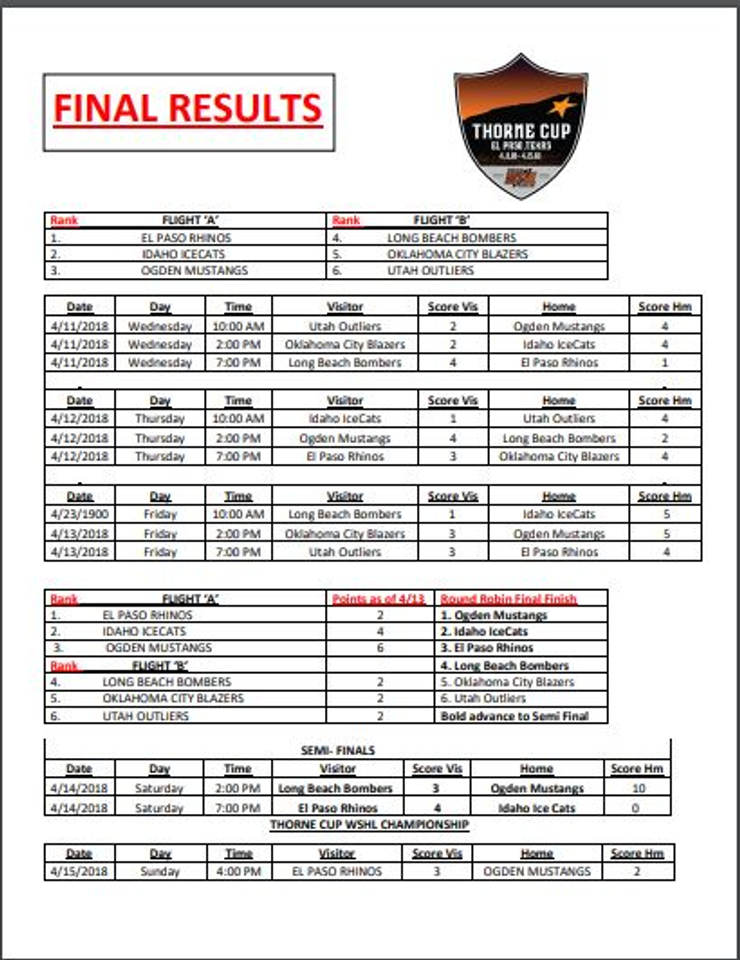 After 11 extremely competitive hockey games, terrific sportsmanship shown by all teams, two teams, the El Paso Rhinos and the Ogden Mustangs earned their way to the final game, the “Thorne Cup Championship Game”.